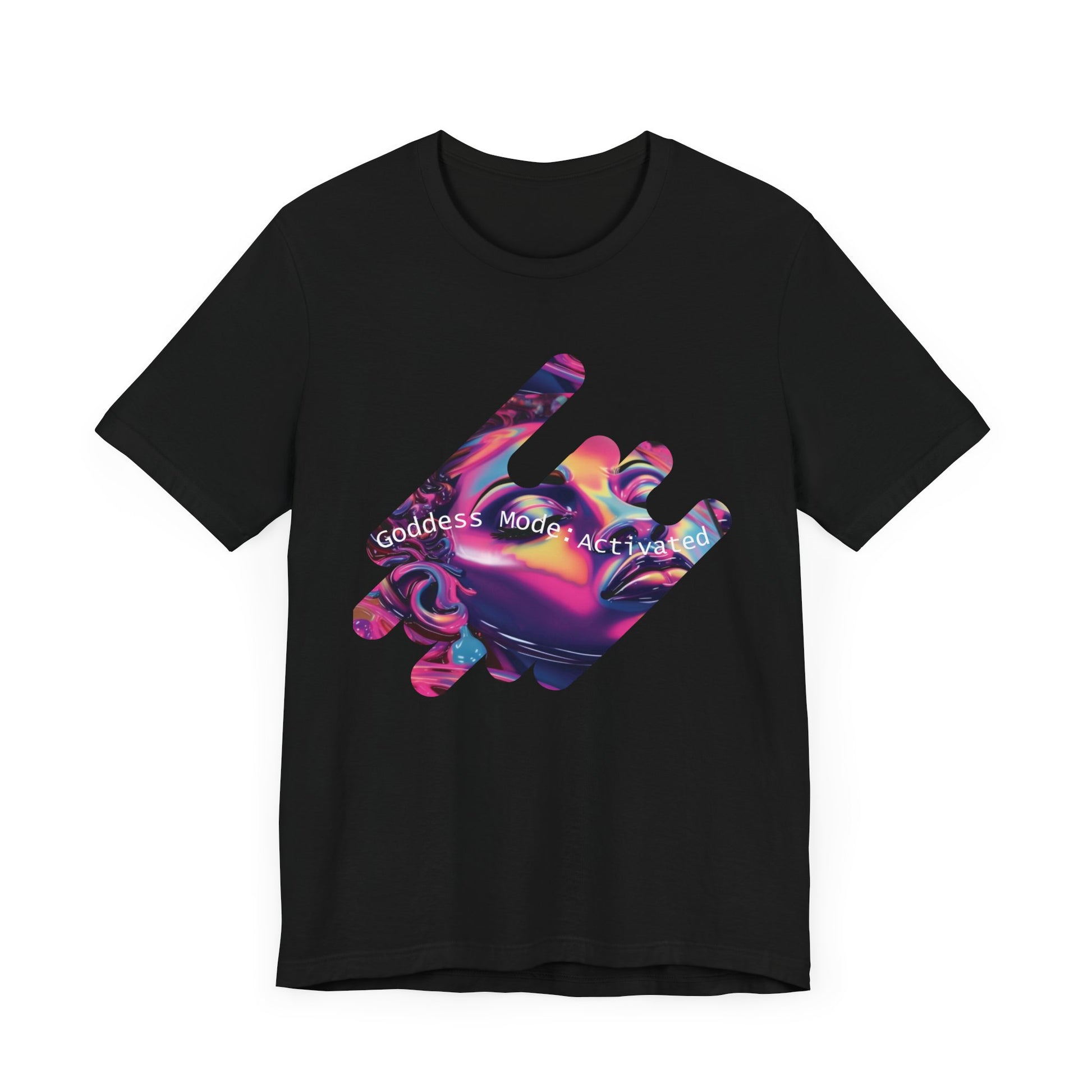 A mesmerizing and futuristic T-shirt featuring a radiant African American woman with holographic, neon-like skin tones in shades of pink, purple, blue, and gold. Perfect for those who appreciate unique and artistic designs. Ideal for casual wear or as a statement piece for special occasions and celebrations.