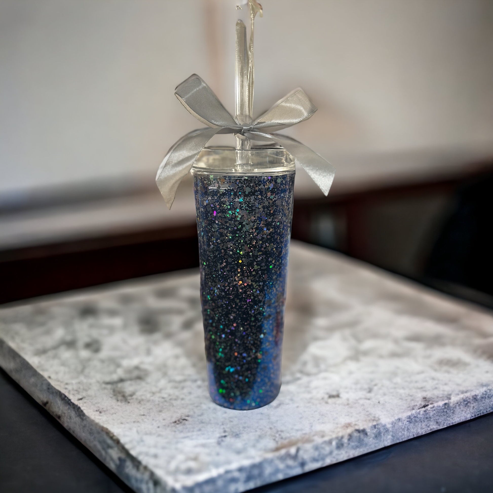 Our snow globe tumbler is a unique and fun addition to your drinkware collection. This tumbler features a clear outer layer with a unique inside, complete with glitter that swirl around when the tumbler is shaken.